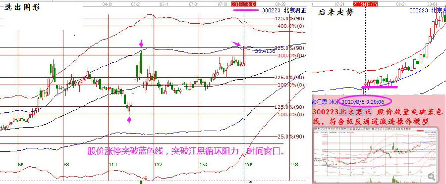 下圖是北京君正之前的一個(gè)激進(jìn)買點(diǎn),現(xiàn)在做個(gè)回顧。8月2日是江恩時(shí)間窗口,當(dāng)天股價(jià)放量漲停突破藍(lán)色線,江恩循環(huán)阻力點(diǎn),構(gòu)成了激進(jìn)買點(diǎn),隨后市場震蕩不破藍(lán)色線,維持藍(lán)色線與紅色線區(qū)間內(nèi)的趨勢上攻走勢。