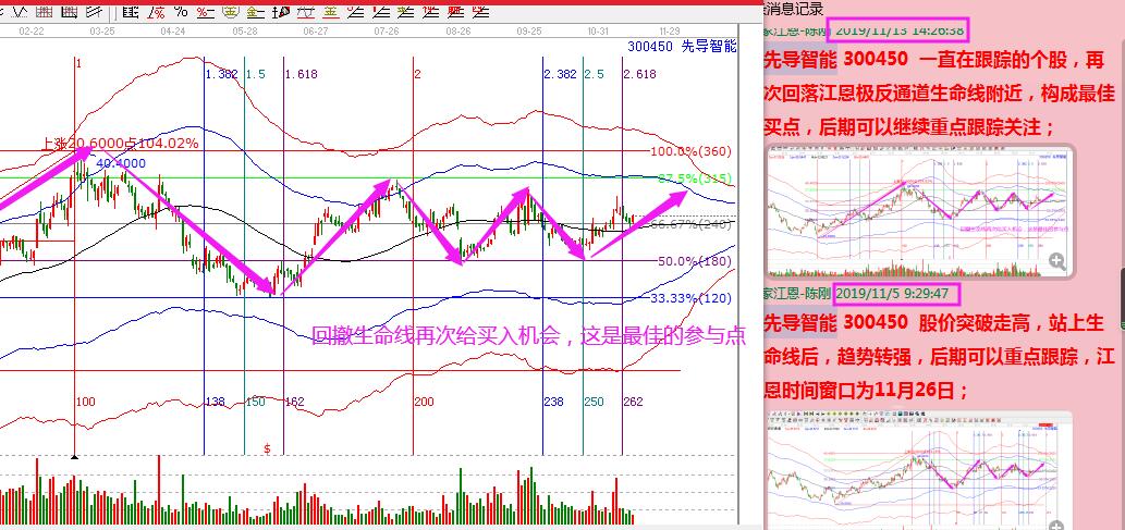 下圖是先導(dǎo)智能生命線的穩(wěn)健買點(diǎn)展示,10月28日股價(jià)放量突破生命線,隨后震蕩跌破,股價(jià)一直縮量生命線附近運(yùn)行,11月5日是站穩(wěn)生命線的第三個(gè)交易日,首次開始關(guān)注,11月13日股價(jià)在經(jīng)過拉升之后回撤至江恩240度支撐點(diǎn),與生命線支撐點(diǎn)很近,價(jià)格上形成共振走勢,同時(shí)股價(jià)處于明確的上漲周期中,故,趨勢,價(jià)格,時(shí)間符合極反通道穩(wěn)健買點(diǎn)要求,按照規(guī)則買入,持股目標(biāo)就是藍(lán)色線。