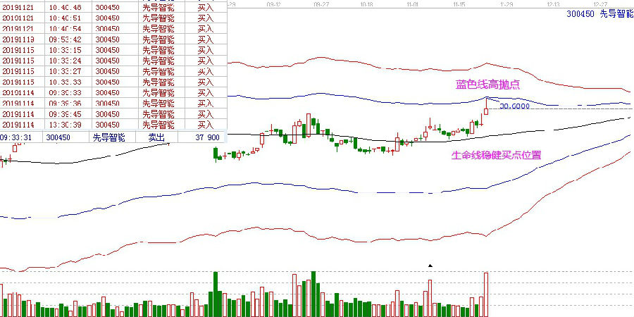 先導(dǎo)智能生命線啟動之后,11月22日攻擊到了目標(biāo)點(diǎn)藍(lán)色線,這是我們生命線穩(wěn)健買點(diǎn)的目標(biāo)點(diǎn),按照規(guī)則可以獲利賣出。下面是具體的走勢圖: