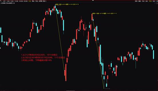 從3127跌到2月4日2685,共10個交易日,從3月5號3074跌到3月19日2646,11個交易日,兩者時間上差一天,空間上跌幅均是14%。