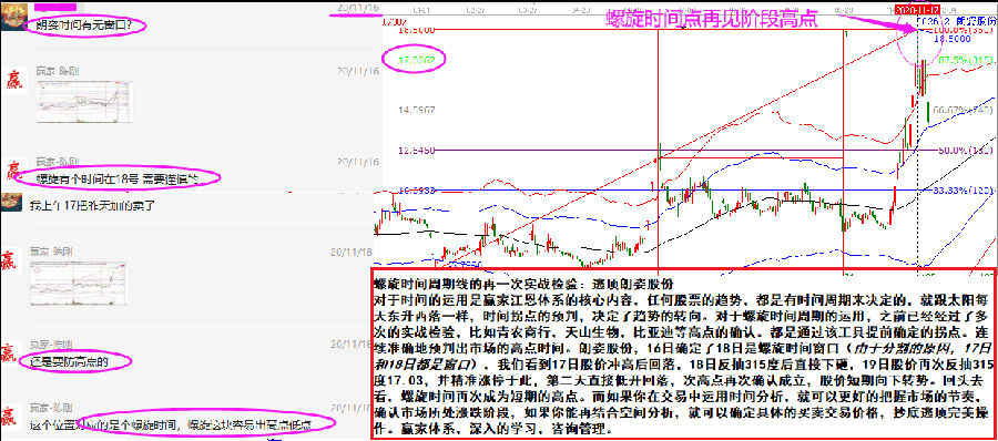 對于時間的運用是贏家江恩體系的核心內(nèi)容,任何股票的趨勢,都是有時間周期來決定的,就跟太陽每天東升西落一樣, 時間拐點的預(yù)判,決定了趨勢的轉(zhuǎn)向。對于螺旋時間周期的運用,之前已經(jīng)經(jīng)過了多次的實戰(zhàn)檢驗,比如青農(nóng)商行,天山生物,比亞迪等高點的確認(rèn)都是通過該工具提前確定的拐點。連續(xù)準(zhǔn)確地預(yù)判出市場的高點時間。朗姿股份,16日確定了18日是螺旋時間窗口( 由于分割的原因,17日和18日都是窗口),我們看到17日股價沖高后回落,18日反抽315度后直接下砸,19日股價再次反抽315度17.03,并精準(zhǔn)漲停于此,第二天直接低開回落,次高點再次確認(rèn)成立,股價短期向下轉(zhuǎn)勢。回頭去看,螺旋時間再次成為短期的高點。而如果你在交易中運用時間分析,就可以更好的把握市場的節(jié)奏,確認(rèn)市場所處漲跌階段;如果你能再結(jié)合空間分析,就可以確定具體的買賣交易價格,抄底逃頂完美操作。