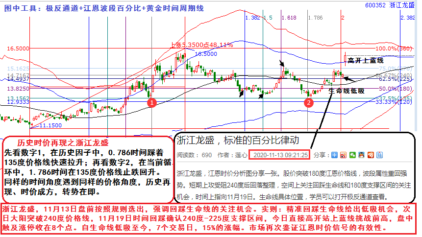 浙江龍盛,11月13日盤前按照規(guī)則選出,強調(diào)回踩生命線的關(guān)注機會。實則:精準(zhǔn)回踩生命線給出低吸機會,次日大陽突破240度價格線,11月19日時間回踩確認(rèn)240度-225度支撐區(qū)間,今日直接高開站上藍(lán)線挑戰(zhàn)前高,盤中觸及漲停收在8個點。自生命線低吸至今,7個交易日,15%的漲幅。市場再次鑒證江恩時價信號的有效性。