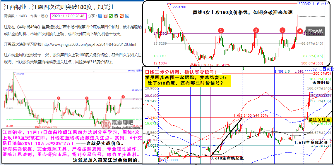 江西銅業(yè),11月17日盤前按照江恩四方法則分享學(xué)習(xí),周線4次上攻180度突破在即、日線在藍(lán)線構(gòu)成激進(jìn)關(guān)注點。實則,6個交易日漲幅20%!10萬元*20%=2萬!這就是實戰(zhàn)價值。