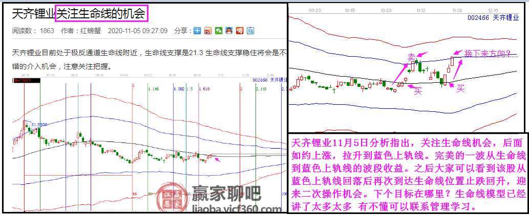 天齊鋰業(yè)11月5日分析指出,關(guān)注生命線機會,后面如約上漲,拉升到藍(lán)色上軌線。完美的一波從生命線到藍(lán)色上軌線的波段收益。之后大家可以看到該股從藍(lán)色上軌線回落后再次到達(dá)生命線位置止跌回升,迎來二次操作機會。下個目標(biāo)在哪里?生命線模型已經(jīng)講了太多太多 有不懂可以聯(lián)系管理學(xué)習(xí)。