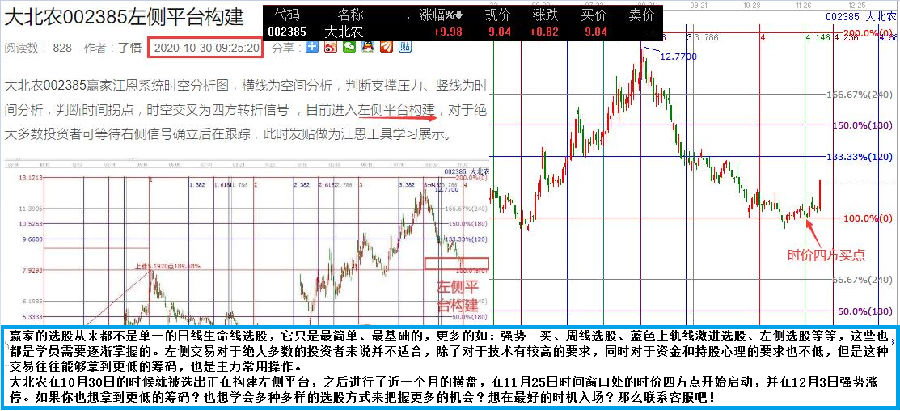 大北農(nóng)在10月30日的時(shí)候就被選出正在構(gòu)建左側(cè)平臺(tái),之后進(jìn)行了近一個(gè)月的橫盤,在11月25日時(shí)間窗口處的時(shí)價(jià)四方點(diǎn)開(kāi)始啟動(dòng),并在12月3日強(qiáng)勢(shì)漲停。