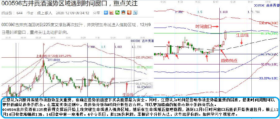 000596古井貢酒在225度獲得支撐后開始上攻突破生命線進(jìn)入強(qiáng)勢(shì)區(qū)域,隨后在生命線附近整理穩(wěn)固,遇到12月9日時(shí)間窗口后股價(jià)開始快速拉升,截止12月14日收盤漲幅超13%,14日盤中曾一度漲停。4個(gè)交易日,超13%的利潤(rùn),掌握這個(gè)分析方法,這些就是你的。