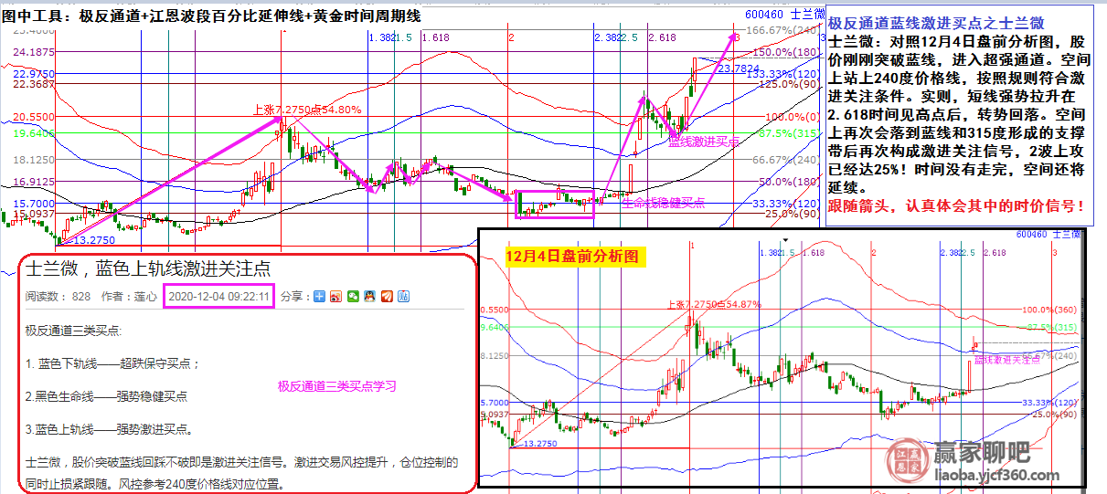 士蘭微:對照12月4日盤前分析圖,股價剛剛突破藍(lán)線,進(jìn)入超強(qiáng)通道。空間上站上240度價格線,按照規(guī)則符合激進(jìn)關(guān)注條件。實則,短線強(qiáng)勢拉升在2.618時間見高點(diǎn)后,轉(zhuǎn)勢回落。空間上再次會落到藍(lán)線和315度形成的支撐帶后再次構(gòu)成激進(jìn)關(guān)注信號,2波上攻已經(jīng)達(dá)25%!時間沒有走完,空間還將延續(xù)。(跟隨箭頭,認(rèn)真體會其中的時價信號?。?/p>