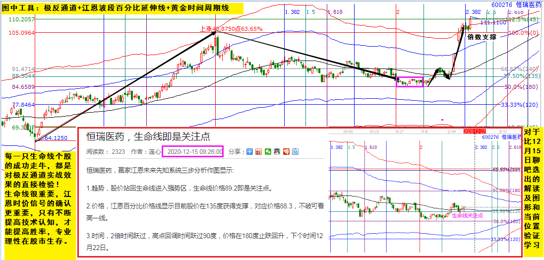 每一只生命線個股的成功走牛,都是對極反通道實戰(zhàn)效果的直接檢驗!生命線很重要,江恩時價信號的確認(rèn)更重要,只有不斷提高技術(shù)認(rèn)知,才能提高勝率,專業(yè)理性在股市生存。恒瑞醫(yī)藥,對比12月15日選出時的分析圖形及詳細(xì)解讀,再看當(dāng)前位置,一波上漲20%的空間,知其然知其所以然很重要。