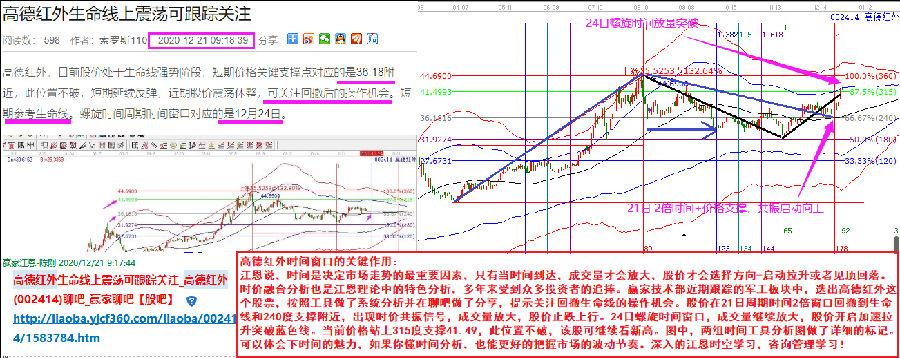 江恩說,時間是決定市場走勢的最重要因素,只有當(dāng)時間到達(dá),成交量才會放大,股價才會選擇方向-啟動拉升或者見頂回落。時價融合分析也是江恩理論中的特色分析,多年來受到眾多投資者的追捧。贏家技術(shù)部近期跟蹤的軍工板塊中,選出高德紅外這個股票,按照工具做了系統(tǒng)分析并在聊吧做了分享,提示關(guān)注回撤生命線的操作機(jī)會。股價在21日周期時間2倍窗口回撤到生命線和240度支撐附近,出現(xiàn)時價共振信號,成交量放大,股價止跌上行。24日螺旋時間窗口,成交量繼續(xù)放大,股價開啟加速拉升突破藍(lán)色線。當(dāng)前價格站上315度支撐41.49,此位置不破,該股可繼續(xù)看新高。圖中,兩組時間工具分析圖做了詳細(xì)的標(biāo)記??梢泽w會下時間的魅力,如果你懂時間分析,也能更好的把握市場的波動節(jié)奏。
