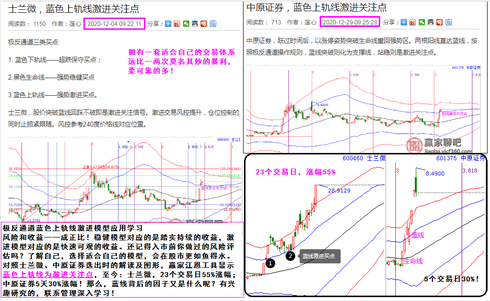 風(fēng)險(xiǎn)和收益——成正比!穩(wěn)健模型對(duì)應(yīng)的是踏實(shí)持續(xù)的收益,激進(jìn)模型對(duì)應(yīng)的是快速可觀的收益。還記得入市前你做過(guò)的風(fēng)險(xiǎn)評(píng)估嗎?了解自己,選擇適合自己的模型,會(huì)在股市更如魚得水。對(duì)照士蘭微、中原證券選出時(shí)的解讀及圖形,贏家江恩工具顯示藍(lán)色上軌線為激進(jìn)關(guān)注點(diǎn),至今:士蘭微,23個(gè)交易日55%漲幅;中原證券5天30%漲幅!