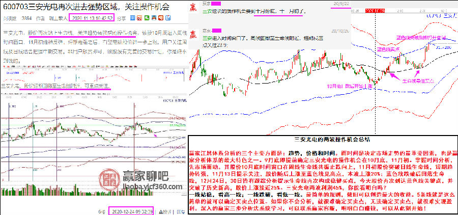 贏家江恩體系分析的三個(gè)主要方面是:趨勢(shì),價(jià)格和時(shí)間。而時(shí)間是決定市場(chǎng)走勢(shì)的最重要因素,也是贏家分析體系的最大特色之一。9月底即提前確定三安光電的操作機(jī)會(huì)在10月底,11月初。掌握時(shí)間分析,先市場(chǎng)而動(dòng)。其股價(jià)10月底時(shí)間窗口在周線生命線共振止跌向上,11月初股價(jià)突破日線生命線,短期趨勢(shì)轉(zhuǎn)強(qiáng),11月13日提示關(guān)注,股價(jià)隨后上漲至藍(lán)色線見(jiàn)高點(diǎn),本波上漲20%;藍(lán)色線跌破后回落生命線,12月24日,30日皆有跟蹤分析提示生命線再次構(gòu)成穩(wěn)健買點(diǎn),今天股價(jià)再次到達(dá)藍(lán)色線關(guān)鍵點(diǎn),并突破了歷史新高,股價(jià)上漲接近25%。三安光電兩波利潤(rùn)45%,你能看明白嗎?