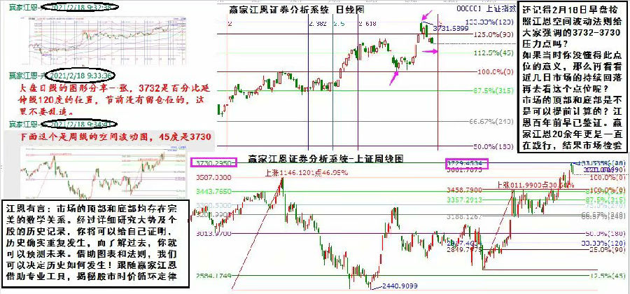 江恩有言:市場(chǎng)的頂部和底部均存在完美的數(shù)學(xué)關(guān)系。經(jīng)過(guò)詳細(xì)研究大勢(shì)及個(gè)股的歷史記錄,你將可以給自己證明,歷史確實(shí)重復(fù)發(fā)生,而了解過(guò)去,你就可以預(yù)測(cè)未來(lái)。借助圖表和法則,我們可以決定歷史如何發(fā)生!跟隨贏家江恩借助專業(yè)工具,揭秘股市時(shí)價(jià)循環(huán)定律! 還記得2月18日早盤(pán)按照江恩空間波動(dòng)法則給大家強(qiáng)調(diào)的3732-3730壓力點(diǎn)嗎?如果當(dāng)時(shí)你沒(méi)懂得此點(diǎn)位的意義,那么再看看近幾日市場(chǎng)的持續(xù)回落再去看這個(gè)點(diǎn)位呢?市場(chǎng)的頂部和底部是不是可以提前計(jì)算的?江恩百年前早已鑒證。贏家江恩20余年更是一直在踐行,結(jié)果市場(chǎng)檢驗(yàn)。