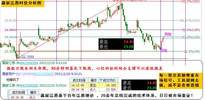 今日差價(jià)任務(wù)完成,小5個(gè)點(diǎn)的利潤(rùn)落袋。對(duì)照?qǐng)D形去看,早盤(pán)指數(shù)直接探至日線生命線、30分鐘藍(lán)線構(gòu)成左側(cè)關(guān)注信號(hào),按照時(shí)價(jià)信號(hào)低吸博差價(jià),如期抵達(dá)阻力高拋離場(chǎng)。而再看預(yù)期的支撐23.25,阻力24.34;實(shí)際日內(nèi)最低23.2,最高24.45,誤差0.05-0.1,在23.5低吸,24.32高拋,近1元的利潤(rùn)不算多,但是日積月累呢?如果你也可以看清股價(jià)的波動(dòng)空間,好股可以做的更好;被套亦可通過(guò)差價(jià)早日解套。技術(shù)決定利潤(rùn),贏家江恩基于百年江恩理論總結(jié)得出的技術(shù)體系,日日被市場(chǎng)驗(yàn)證。在市場(chǎng)里的每一筆交易,都是尊重市場(chǎng)信號(hào),按照工具規(guī)則去做,絕不是貪婪恐懼。