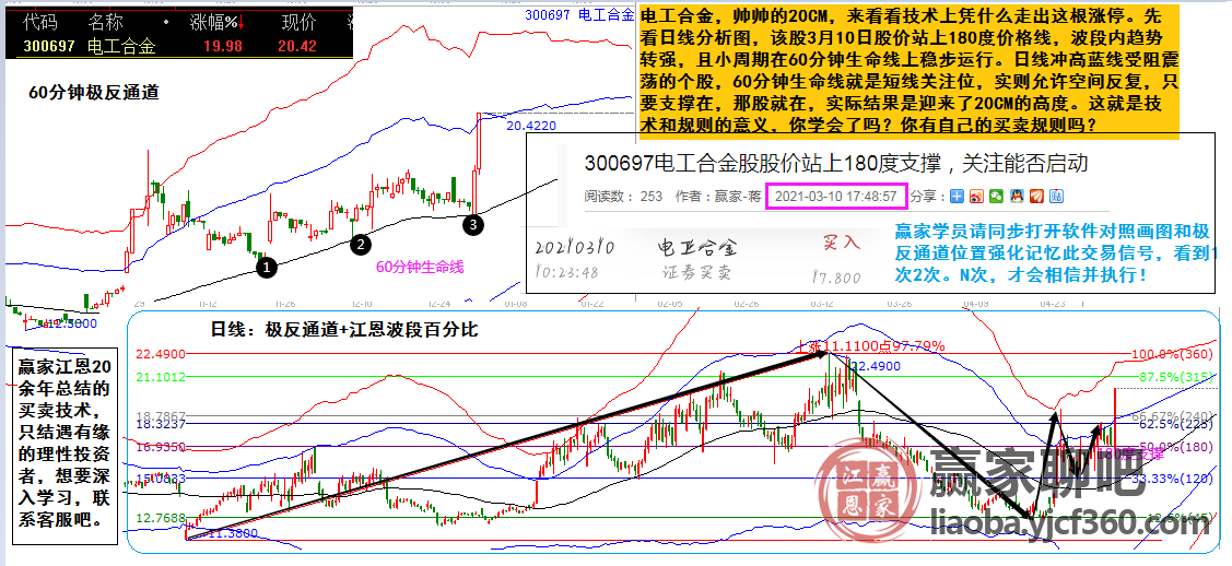 電工合金,帥帥的20CM,來看看技術(shù)上憑什么走出這根漲停。先看日線分析圖,該股3月10日股價站上180度價格線,波段內(nèi)趨勢轉(zhuǎn)強,且小周期在60分鐘生命線上穩(wěn)步運行。日線沖高藍(lán)線受阻震蕩的個股,60分鐘生命線就是短線關(guān)注位,實則允許空間反復(fù),只要支撐在,那股就在,實際結(jié)果是迎來了20CM的高度。這就是技術(shù)和規(guī)則的意義,你學(xué)會了嗎?你有自己的買賣規(guī)則嗎?