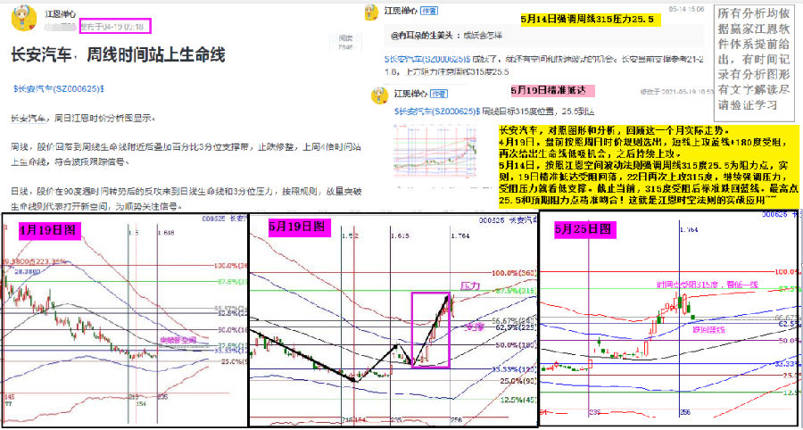 5月14日,按照江恩空間波動法則強調(diào)周線315度25.5為阻力點,實則,19日精準抵達受阻回落,22日再次上攻至315度,繼續(xù)強調(diào)壓力,受阻壓力就看低支撐。截至當前,315度受阻后標準跌回藍線。最高點25.5和預(yù)期阻力點精準吻合!這就是江恩時空法則的實戰(zhàn)應(yīng)用。