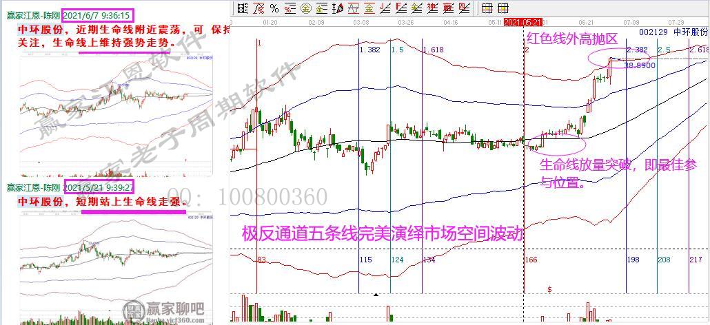 5月21日時間窗口開始關(guān)注中環(huán)股份,當(dāng)日,生命線跌破后,5月31日再次放量突破,回踩不破,構(gòu)成最佳生命線技術(shù)買點。隨后開啟拉升階段。今天再次放量大漲,股價突破紅色線,生命線啟動后累計上漲超過40%;紅色線外高風(fēng)險區(qū),保持謹(jǐn)慎。從買到賣,從生命線到紅色線,交易信號明確。極反通道完美把握市場的空間波動。按照買賣信號交易,做理性投資。