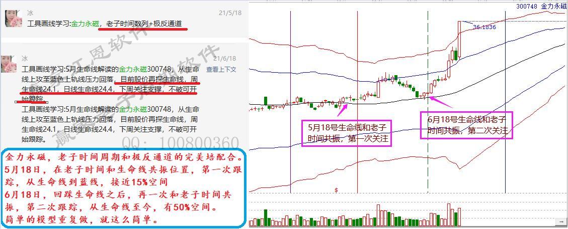 5月18日,老子時價和生命線共振位置,第一次跟蹤,從生命線到藍(lán)線,接近15%空間。6月18日,回踩生命線之后,再一次和老子時間周期共振,第二次開始跟蹤,從生命線至今,有50%空間。股不需要多,在于精。好的機會,簡單的模型重復(fù)做,操作就是這么簡單。
