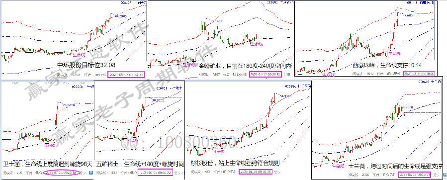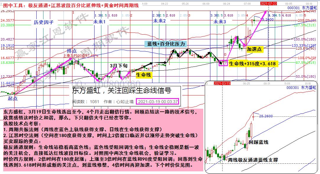 中環(huán)股份,對照群中的選出跟蹤時間,在實際分析走勢圖上一步步去看。5月21日(2倍時間)選出,不破180度即為洗盤;6月初站上生命線多次給出低吸機(jī)會,6月下旬突破藍(lán)線進(jìn)入超強(qiáng)通道,紅線受阻后,382時間踩著藍(lán)線再次迎來快速拉升,目前出軌走妖,下個時空如圖!