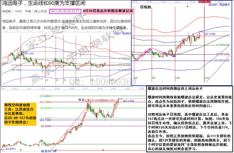 對照鴻遠電子日線圖,選中螺旋歷法工具后,單擊157高點這一天即可完成時間計算。如圖:106天站回日線生命線,確認趨勢拐點后,展開這波上攻。下個時間135天對應8月17日附近,下個空間先看174,再看紅色線?! ?/p>