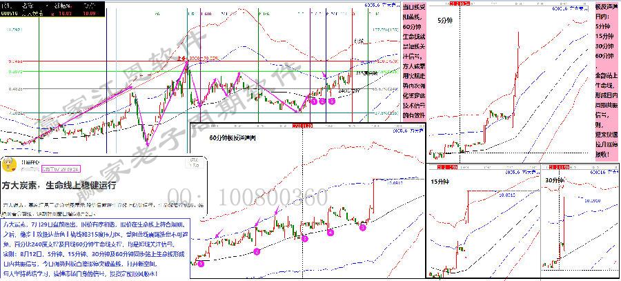 7月29日盤前選出,時價有序和諧,股價在生命線上符合規(guī)則。之后,穩(wěn)步上攻抵達藍色上軌線和315度壓力區(qū)。受阻藍線震蕩洗盤不可避免,百分比240度支撐及日線60分鐘生命線支撐,均是短線關注信號。同時:8月12日,5分鐘、15分鐘、30分鐘及60分鐘同步站上生命線形成日內(nèi)共振信號,今日強勢封板直接漲停突破藍線,打開新空間?! ?/p>
