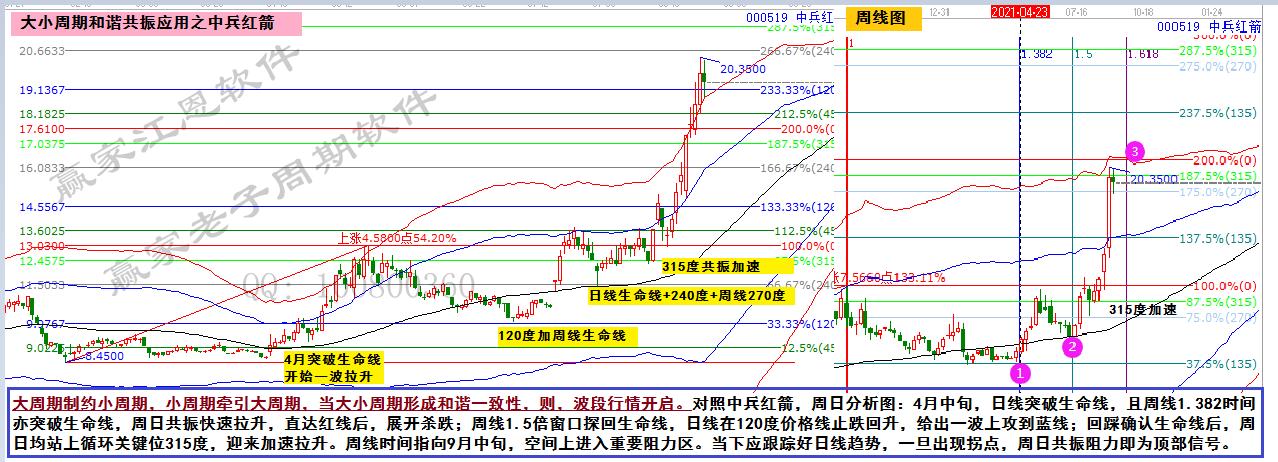 大周期制約小周期,小周期牽引大周期,當(dāng)大小周期形成和諧一致性,則,波段行情開啟。對照中兵紅箭,周日分析圖:4月中旬,日線突破生命線,且周線1.382時間亦突破生命線,周日共振快速拉升,直達紅線后,展開殺跌;周線1.5倍窗口探回生命線,日線在120度價格線止跌回升,給出一波上攻到藍線;回踩確認生命線后,周日均站上循環(huán)關(guān)鍵位315度,迎來加速拉升。周線時間指向9月中旬,空間上進入重要阻力區(qū)。當(dāng)下應(yīng)跟蹤好日線趨勢,一旦出現(xiàn)拐點,周日共振阻力即為頂部信號。