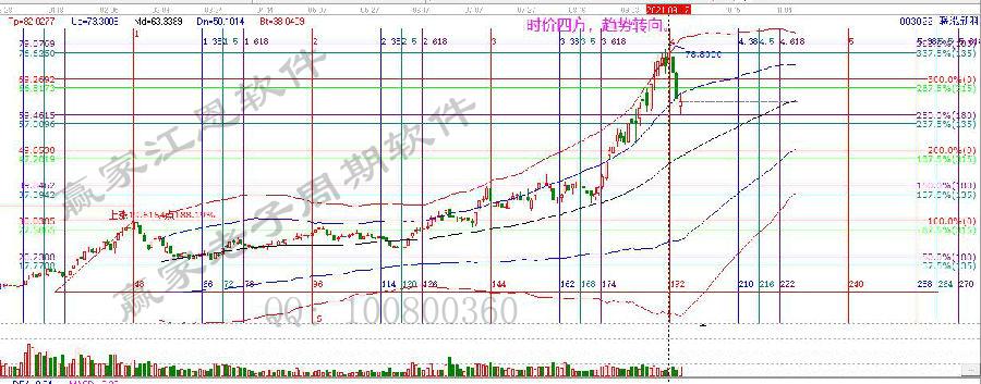 在日線做時(shí)空細(xì)化分析圖,一組江恩螺旋時(shí)間、一組江恩波段百分比,即可直觀顯示波動(dòng)旋律。