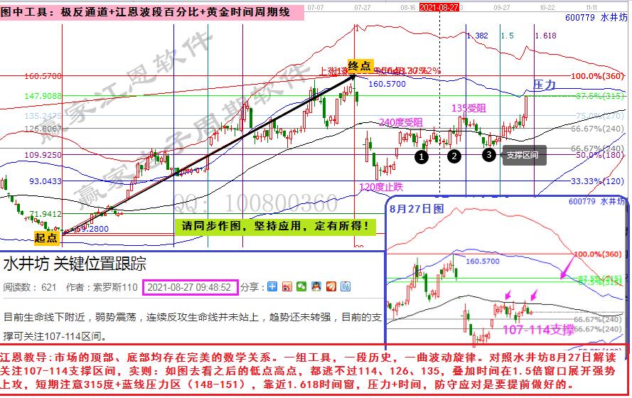 江恩教導(dǎo):市場(chǎng)的頂部、底部均存在完美的數(shù)學(xué)關(guān)系。一組工具,一段歷史,一曲波動(dòng)旋律。對(duì)照水井坊8月27日解讀關(guān)注107-114支撐區(qū)間,實(shí)則:如圖去看之后的低點(diǎn)高點(diǎn),都逃不過(guò)114、126、135,疊加時(shí)間在1.5倍窗口展開強(qiáng)勢(shì)上攻,短期注意315度+藍(lán)線壓力區(qū)(148-151),靠近1.618時(shí)間窗,壓力+時(shí)間,防守應(yīng)對(duì)是要提前做好的。