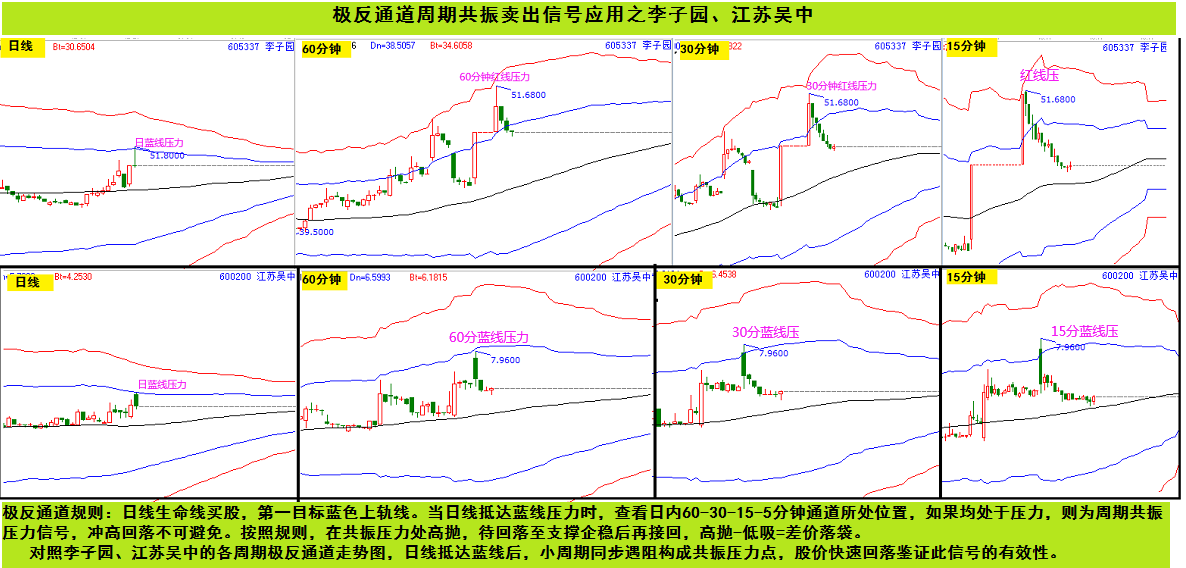 日線生命線買股,第一目標(biāo)藍(lán)色上軌線。當(dāng)日線抵達(dá)藍(lán)線壓力時,查看日內(nèi)60-30-15-5分鐘通道所處位置,如果均處于壓力,則為周期共振壓力信號,沖高回落不可避免。按照規(guī)則,在共振壓力處高拋,待回落至支撐企穩(wěn)后再接回,高拋-低吸=差價落袋。對照李子園、江蘇吳中的走勢圖,日線抵達(dá)藍(lán)線后,小周期同步遇阻構(gòu)成共振壓力點,股價快速回落鑒證此信號的有效性。