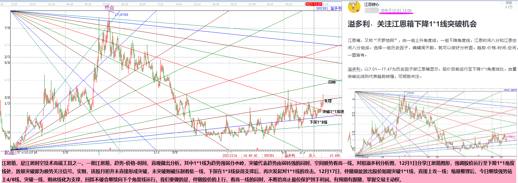 江恩箱,是江恩時空技術(shù)高端工具之一。一組江恩箱,趨勢-價格-時間,直觀做出分析。其中1*1線為趨勢強(qiáng)弱分水嶺,突破代表趨勢由弱轉(zhuǎn)強(qiáng)的同時,空間順勢看高一線。對照溢多利分析圖,12月1日分享,強(qiáng)調(diào)股價運(yùn)行至下降1*1角度線處,放量突破即為順勢關(guān)注信號。實則,該股月初并未直接形成突破,未突破則被壓制看低一線,下探在1*3線獲得支撐后,再次發(fā)起對1*1線的攻擊。12月17日,伴隨量能放出股價如期突破1*1線,直接上攻一線;縮量整理后,今日繼續(xù)強(qiáng)勢站上4/8線。突破一線,則此線化為支撐,回踩不破會繼續(xù)向下個角度線運(yùn)行。我們要做的是,伴隨股價的上行,看高一線的同時,不斷抬高止盈位保護(hù)到手利潤。有預(yù)期有跟隨,掌握交易主動權(quán)。