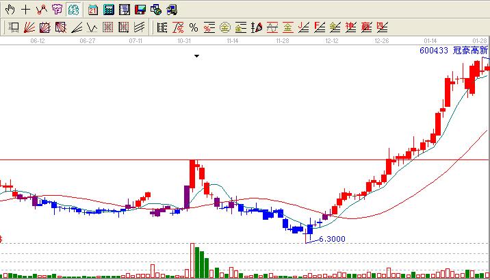 反觀歷史我們會發(fā)現(xiàn)蛛絲馬跡:600433在2012-11-01日放量后9.00一路跌倒6.30位置然后開始了10連陽。這個也有人叫做十全十美,一般會走出一波行情,那么600433在走出十全十美之后一直是馬不停蹄緩緩上行,在其2012-12-27日很小的量過了9.00附近的高點創(chuàng)出了歷史新高,這個位置沒有停留多久就再一次新高基本是3天5天一個新高也不理會大盤,就那樣一直橫行無阻的新高著。很多人都發(fā)現(xiàn)了這個股票不錯,但是都是啃一口就走掉了,就這樣一直看著他新高。江恩的話在這個案例中再一次發(fā)揮的淋漓盡致。也充分的說明了江恩理論在其實戰(zhàn)中的一個地位,就看你是如何理會江恩理論了。