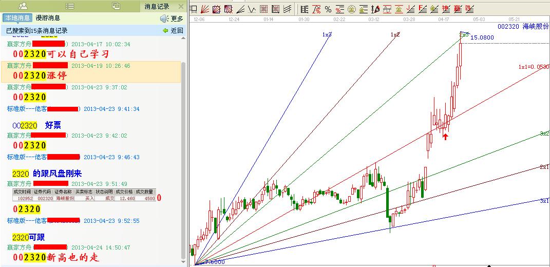 002320海峽股份在7.60見底后快速上行至10.88位置快速殺跌洗盤這個(gè)重要的底高點(diǎn)構(gòu)成沖角度線1*1線,連續(xù)5天的暴跌剛好跌至上升角度線3*1線的位置止跌上行,然后按照角度線運(yùn)行規(guī)則站穩(wěn)一線看高一線原則穩(wěn)步上揚(yáng),基本都是天天陽(yáng)線,說(shuō)明了其主力志在高遠(yuǎn)特別是在拉升前13-04-03日一個(gè)大陰線洗盤隨后直接漲停方式突破3*2線 直接上行至1*1線位置短期漲幅超過(guò)30%很多人都望而生畏,不管大盤如何殺跌,主力始終為啥1*1角度線震蕩并且都是陽(yáng)線,2013-04-16日一個(gè)假跌破1*1角度線吸引了我的眼球,偶后在2013-04-17日開始對(duì)其進(jìn)行了交易,讓大家多用心學(xué)習(xí)這個(gè)個(gè)股研究,按照江恩規(guī)則角度線支撐一線看高一線原則,角度線1*1線不破最好看高至2*3線的位置,介入后震蕩一日后開始了向角度線2*3線進(jìn)攻,好不理會(huì)大盤漲跌我行我素,走出了一個(gè)較為獨(dú)立的行情,今天最高點(diǎn)觸摸角度線2*3線位置實(shí)現(xiàn)了6個(gè)交易日23%的收益.