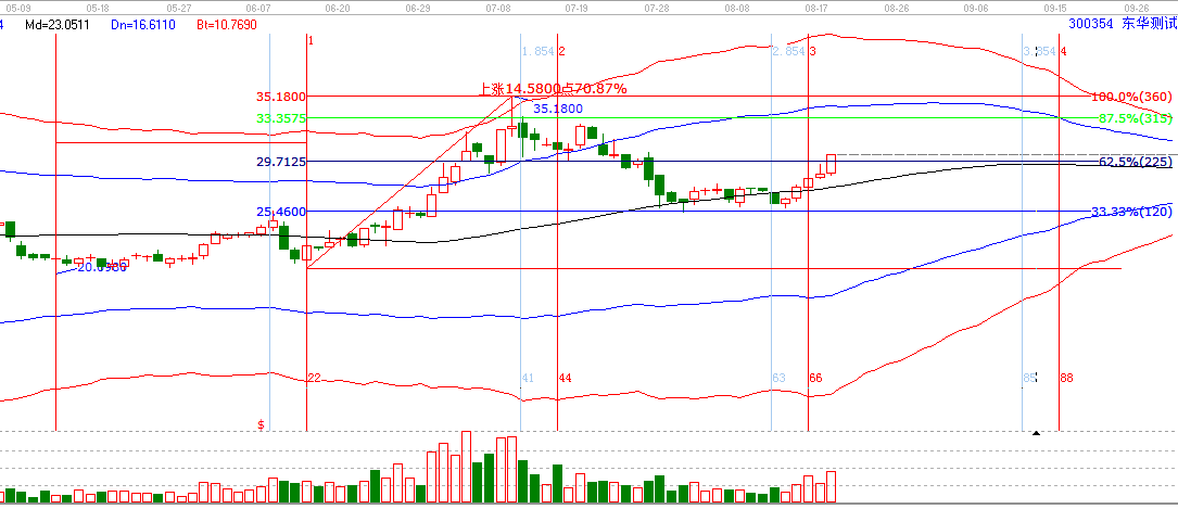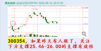 2.江恩工具分析共振:贏家聊吧在8月10日發(fā)布300354相關(guān)分析貼。時(shí)間窗和極反通道生命線形成共振。形成了操作的條件,然后回調(diào)了兩天時(shí)間,在群里有跟蹤分析,關(guān)注25.46的支撐有效性,經(jīng)過(guò)調(diào)整確認(rèn),回踩在支撐位止跌,正是開(kāi)始上漲。