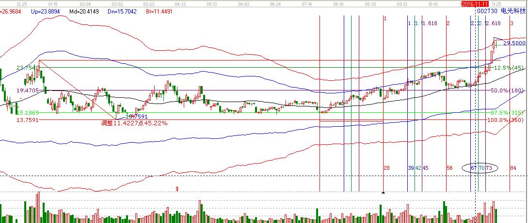 2.工具解析:首先看趨勢(shì)工具,該股近期處于生命線上與藍(lán)色線之間震蕩上行,趨勢(shì)上保持強(qiáng)勢(shì),因此,按照極反通道的操作規(guī)則,生命線附近即可參與,按照“一線站穩(wěn),看高一線;一線破位,看低一線?!钡牟僮饕?guī)則即可。然后看價(jià)格,波段百分比是最簡(jiǎn)單的江恩式價(jià)格分析工具,其原理是江恩理論三分八分原理,而其中最重要的一個(gè)分割位就是50%,也就是180度分割,市場(chǎng)在11月11日前后處于180度支撐附近,此位置是生命線支撐與價(jià)格支撐的共振位,所以是非常好的一個(gè)參與點(diǎn)位。最后,時(shí)間上,通過(guò)時(shí)間工具可以清晰的看到11月14日是時(shí)間窗口,所以,時(shí)間點(diǎn)前一天11月11日,根據(jù)工具分析,提醒買入機(jī)會(huì)。