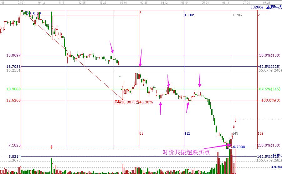 在上面的圖形中,做波段百分比延伸線,可以看到個股在連續(xù)大跌之后,在百分比150.0%的位置獲得價格支撐,按照江恩價格操作規(guī)則,買在價格支撐,賣在價格阻力,知道為站穩(wěn)就是新的買點。個股在支撐位橫盤幾天時間,經(jīng)過大跌-大漲-大跌-漲停,反復(fù)糾結(jié)最終確認(rèn)價格支撐位有效性,從價格上單條件符合買進(jìn)條件。