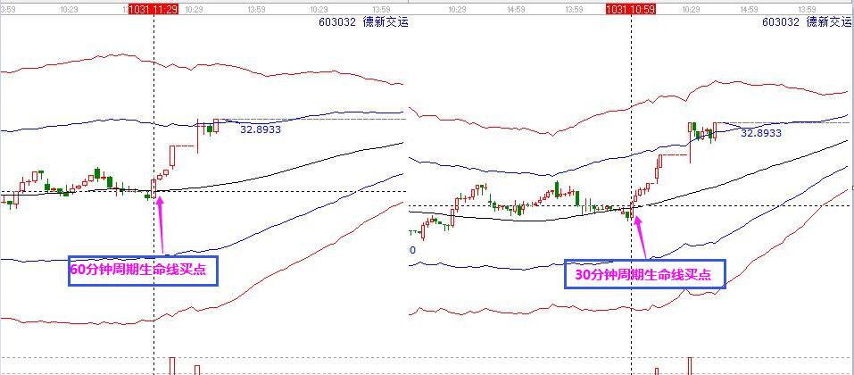 生命線最佳買點(diǎn):在30分鐘和60分鐘周期中,個股在31號都處于生命線位置,符合生命線最佳買點(diǎn)操作規(guī)則。