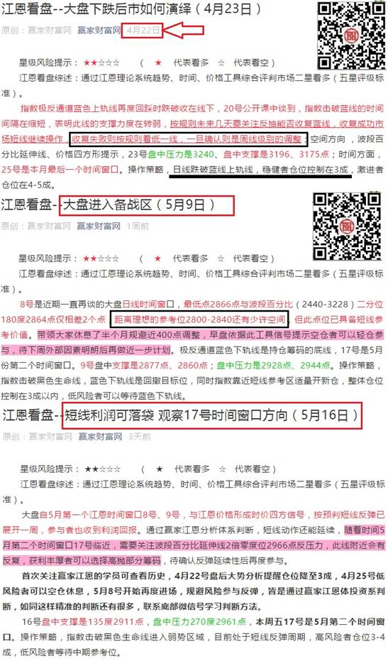 大盤五一節(jié)后的反彈,在5月17日時(shí)間窗口宣告結(jié)束。贏家江恩從4月22日盤中明確提示風(fēng)險(xiǎn),到等待5月8日-9日時(shí)間窗口備戰(zhàn)交易,并于2800-2840區(qū)間進(jìn)行短線抄底建倉(cāng),到5月17日2966點(diǎn)附近見(jiàn)頂回落。投資者再次經(jīng)歷了一次市場(chǎng)的完美漲跌,從0到360度完成一個(gè)漲跌循環(huán)。對(duì)于市場(chǎng)的判斷,贏家大勢(shì)分析都有展示,在此我們做下回顧。