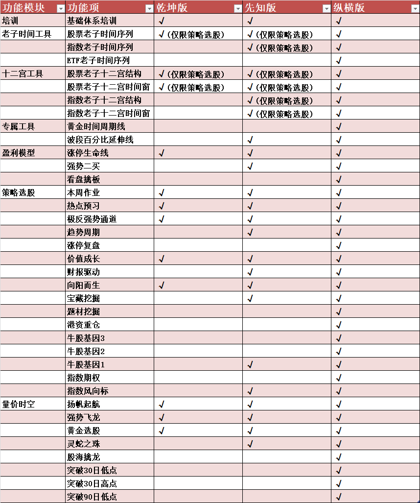 該系統(tǒng)共分為三個(gè)版本:縱橫版、先知版、乾坤版。版本越高,功能越全,服務(wù)越好,選股更智能、決策更高效。