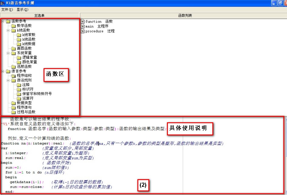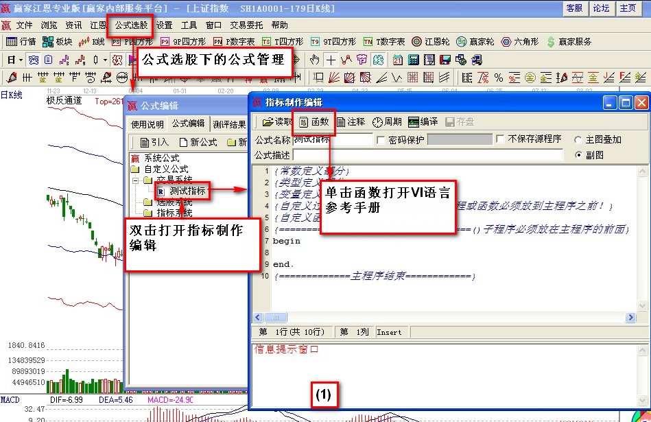 贏家江恩股票軟件函數(shù)如何查看?在進(jìn)入到軟件之后,點擊最上面的一欄中的公式選股,選擇下面的公司管理,雙價打開指標(biāo)制作編輯,然后在彈出的對話框中單擊函數(shù)打開VI語言參考手冊沒然后我們就可以看到顯影的函數(shù)區(qū),以及具體的使用說明。當(dāng)然通過文字不方便大家的記憶,下面就是客服人員為大家整理的相應(yīng)的圖片步驟,幫助大家的記憶。