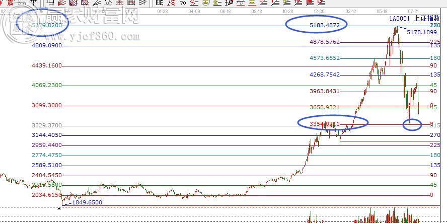 如上證指數(shù)分析圖。我們選取K線價(jià)格四方形這個(gè)江恩特色價(jià)格工具,分別以1849和3049兩個(gè)重要低點(diǎn)作為起點(diǎn),步長(zhǎng)采用起點(diǎn)縮小十倍作圖如下??梢钥吹?/span>1849出發(fā)的180度落在了5179,而3049出發(fā)的270度落在了5183,兩者都同時(shí)顯示5180附近是重要的壓力區(qū),兩組循環(huán)的重要角度疊加共振——5178頂部形成,必須高拋,換來(lái)了一路暴跌!自5178的暴跌在下方315度和0度相交的位置3354附近形成支撐帶,而實(shí)際市場(chǎng)在3373點(diǎn)展開了反彈。
