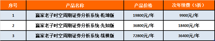 《贏家老子時(shí)空周期證券分析系統(tǒng)》于2021年4月8日正式上線,共分為3個(gè)版本,具體收費(fèi)如下: