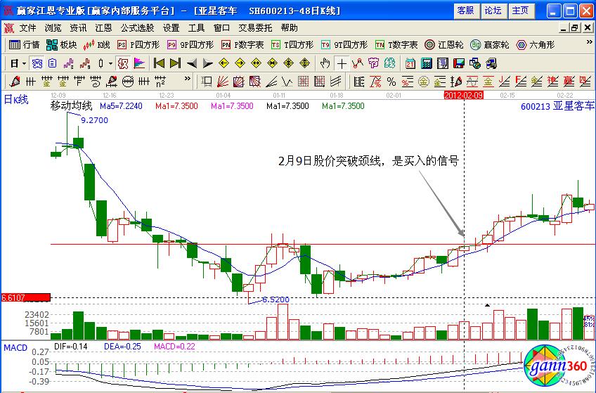 具體的案例如圖亞星客車(600213)的股價在經(jīng)過一波大幅下跌趨勢之后,在低位出現(xiàn)逐漸的企穩(wěn),并形成了雙底的形態(tài),這個時候觀察買點可以發(fā)現(xiàn)在2月9日的時候均線向上突破了頸線,出現(xiàn)了該股的買點,投資者可以介入。