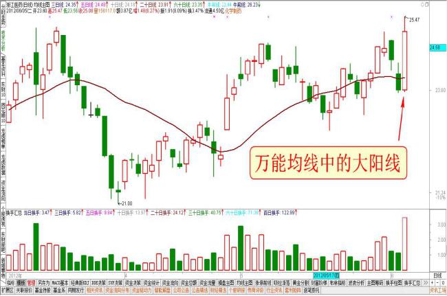 在股市的交易變化中,K線是最好的觀察形式,在觀察K線走勢行情的同時,可以借助股票分析軟件進行研究和分析,特別是其中的大陽線與平均線的走勢關系,是研究的重點。