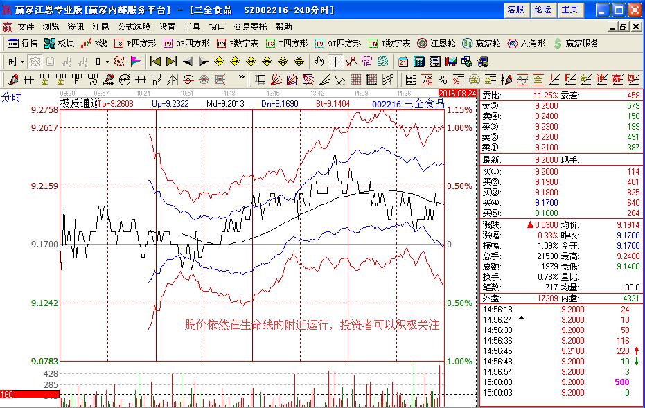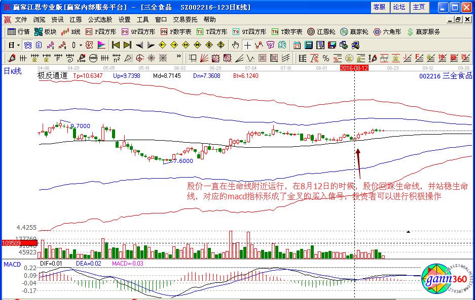 那么在了解了基本的消費(fèi)類股票之后,投資者應(yīng)該怎樣分析消費(fèi)類股票呢,我們可以通過(guò)三全食品(002216)的個(gè)股走勢(shì)進(jìn)行分析,如圖該股在2016年8月份在極反通道生命線附近的走勢(shì),股價(jià)在8月12日的時(shí)候,回踩生命線,是在強(qiáng)勢(shì)區(qū)域中運(yùn)行,而且對(duì)應(yīng)的macd指標(biāo)給出的是金叉買入的操作信號(hào),投資者可以大膽的進(jìn)行買入操作,同時(shí)注意其上方藍(lán)色上軌線是股價(jià)上漲的壓力位置,在不突破壓力出現(xiàn)下跌回調(diào)的時(shí)候,可以考慮賣出操作。