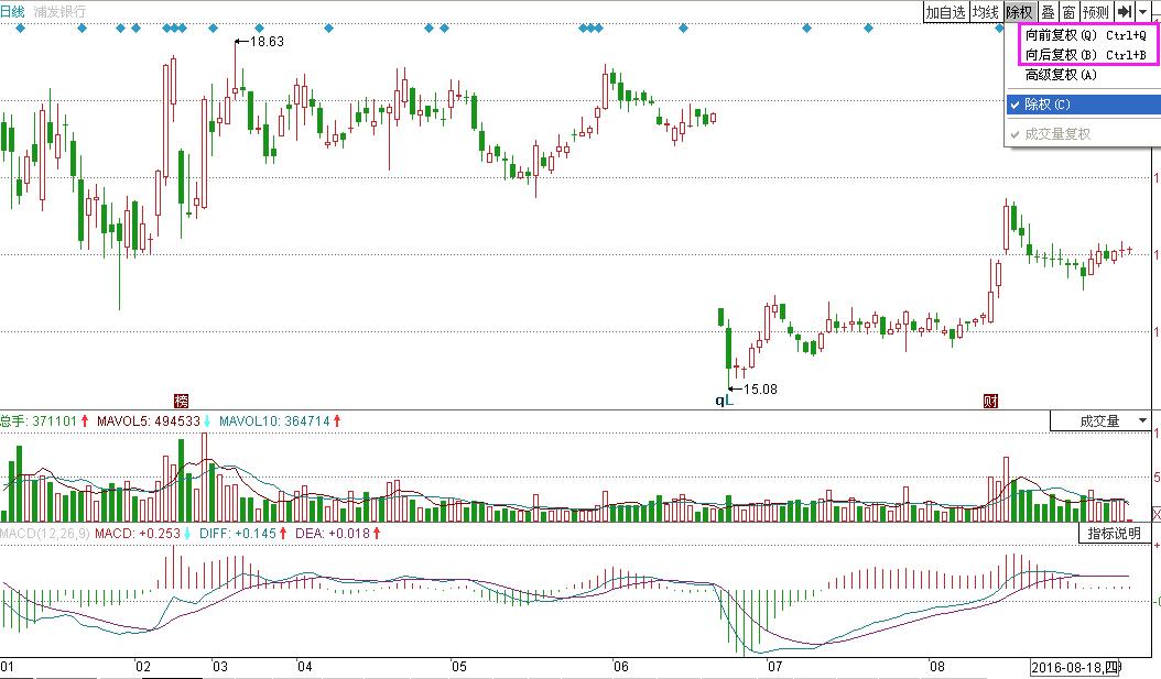 需要注意的是:向前復(fù)權(quán)的當(dāng)前周期顯示的價格和K線顯示價格完全一致,而向后復(fù)權(quán)的所顯示的價格大多高于K線顯示價格;