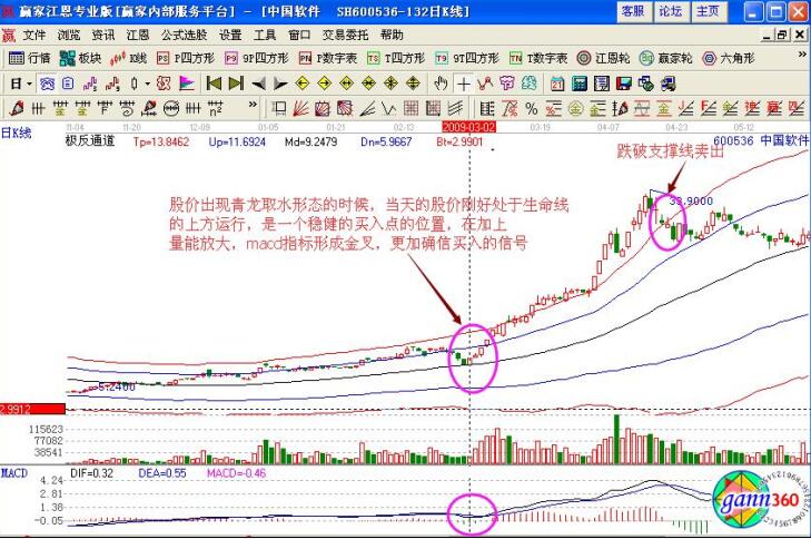 同時(shí)對比在極反通道中的走勢形態(tài),股價(jià)在3月2日的時(shí)候剛好處于生命線的上方,是強(qiáng)勢運(yùn)行的信號(hào),而且量能微微縮小,macd指標(biāo)形成金叉走勢,之后的量能逐漸的放大,是一個(gè)穩(wěn)健的買入點(diǎn),之后股價(jià)向上突破了藍(lán)色上軌線,并突破紅色外軌線運(yùn)行,在股價(jià)跌破紅色外軌線的時(shí)候,投資者要考慮賣出的操作。