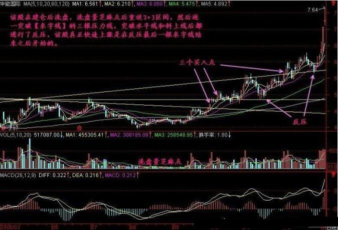 同理可以分析,華能國際從2006年2月到8月的股價(jià)走勢(shì),在建倉洗盤后,量能較小,此時(shí)形成的米字線形態(tài),需要投資者注意其中的三根壓力線與股價(jià)的變化,突破水平線,和斜向上線后都進(jìn)行了反壓,在突破壓力之后,才會(huì)出現(xiàn)真正的上漲,其中,最后一根線突破之后的上漲幅度是最大的,希望投資者能夠把握其中的買入點(diǎn)位置。
