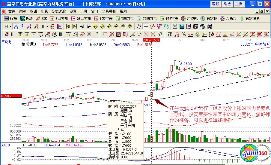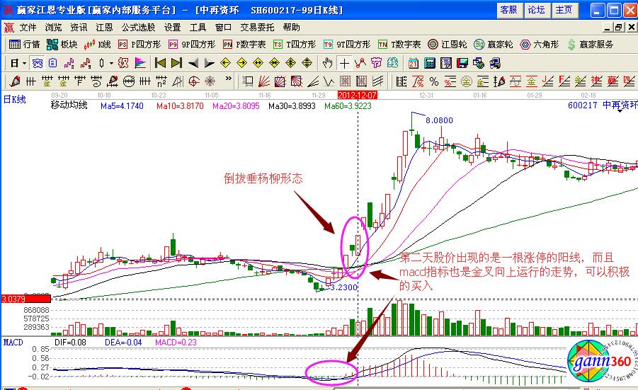 按照基本的技術(shù)操作要點(diǎn)進(jìn)行分析,如圖中再資環(huán)(600217)在2012年12月7日的股價(jià)走勢(shì),形成了倒拔垂楊柳的基本K線組合形態(tài),處于上漲的走勢(shì)形態(tài),而且均線是多頭發(fā)散的形態(tài),對(duì)應(yīng)的macd指標(biāo)也是剛剛出現(xiàn)金叉之后,向上攀升運(yùn)行的趨勢(shì),投資者可以積極的進(jìn)行關(guān)注。