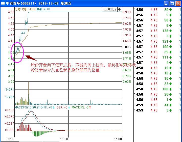 依據(jù)倒拔垂楊柳的應(yīng)用技巧,對(duì)比在分時(shí)圖中的走勢(shì)進(jìn)行分析,可以看出在股價(jià)低開(kāi)的時(shí)候是最佳的介入點(diǎn)位置,在2012年12月7日股價(jià)低開(kāi)高走,不斷的向上拉升,在10點(diǎn)半之前就形成了漲停板的走勢(shì),其中投資者的介入位置就是股價(jià)低開(kāi)的位置,希望投資者積極的把握實(shí)戰(zhàn)中的操作機(jī)會(huì)。