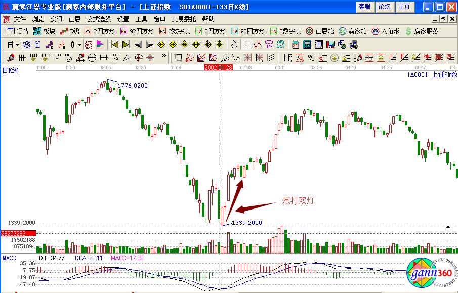 具體的實戰(zhàn)操作案例如圖上證指數(shù)在2002年1月底的股價走勢,前期經(jīng)過一波深度的下跌走勢,在1月28日前后形成了炮打雙燈戰(zhàn)法的兩陽加一陰的走勢形態(tài),而且此時的量能是比較充足的,說明指數(shù)價格將要止跌企穩(wěn),投資者可以繼續(xù)關(guān)注后期的走勢變化。