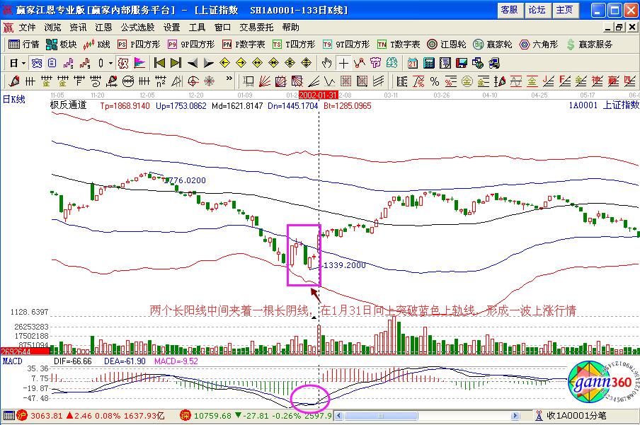 通過江恩軟件進行分析,發(fā)現(xiàn)在1月28日的時候,K線形成的是兩個長陽線中間夾著一些小陽線和一根長陰線,并且在1月31日的時候,向上突破藍(lán)色上軌線,預(yù)示著一波上漲的走勢行情,再加上此時macd指標(biāo)形成的是金叉買入的操作信號,投資者可以積極的金叉買入操作。